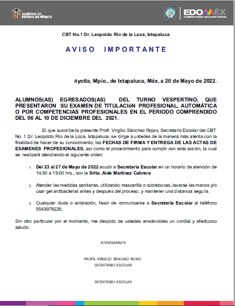Se extiende la presente invitación a las y los egresados convocados a participar de la Ceremonia de Entrega de Títulos Profesionales el día 21 de febrero 2024, a las 11:00 am en la explanada del CBT No. 1 Dr. Leopoldo Rio de la Loza, Ixtapaluca